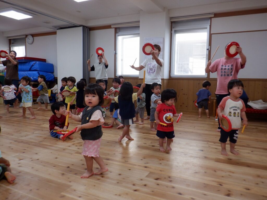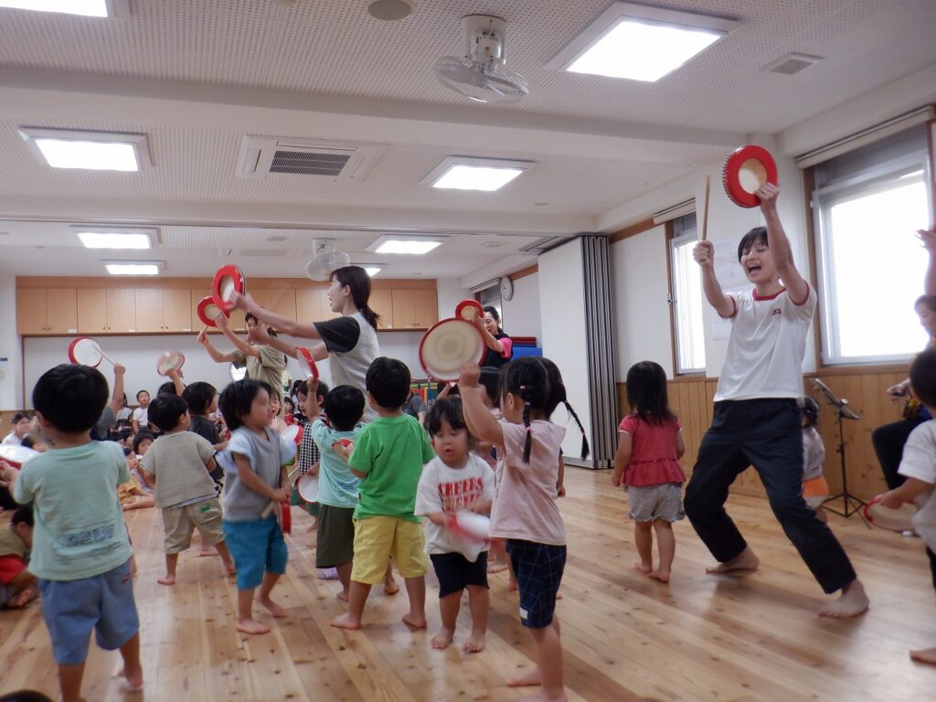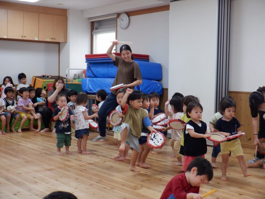 年長おひさまぐみさんは、衣装も付けて、パーランクをたたき、踊る姿を見せてくれ、ほいくえんのみんなの憧れとなり、ますますエイサー大好きになっています。